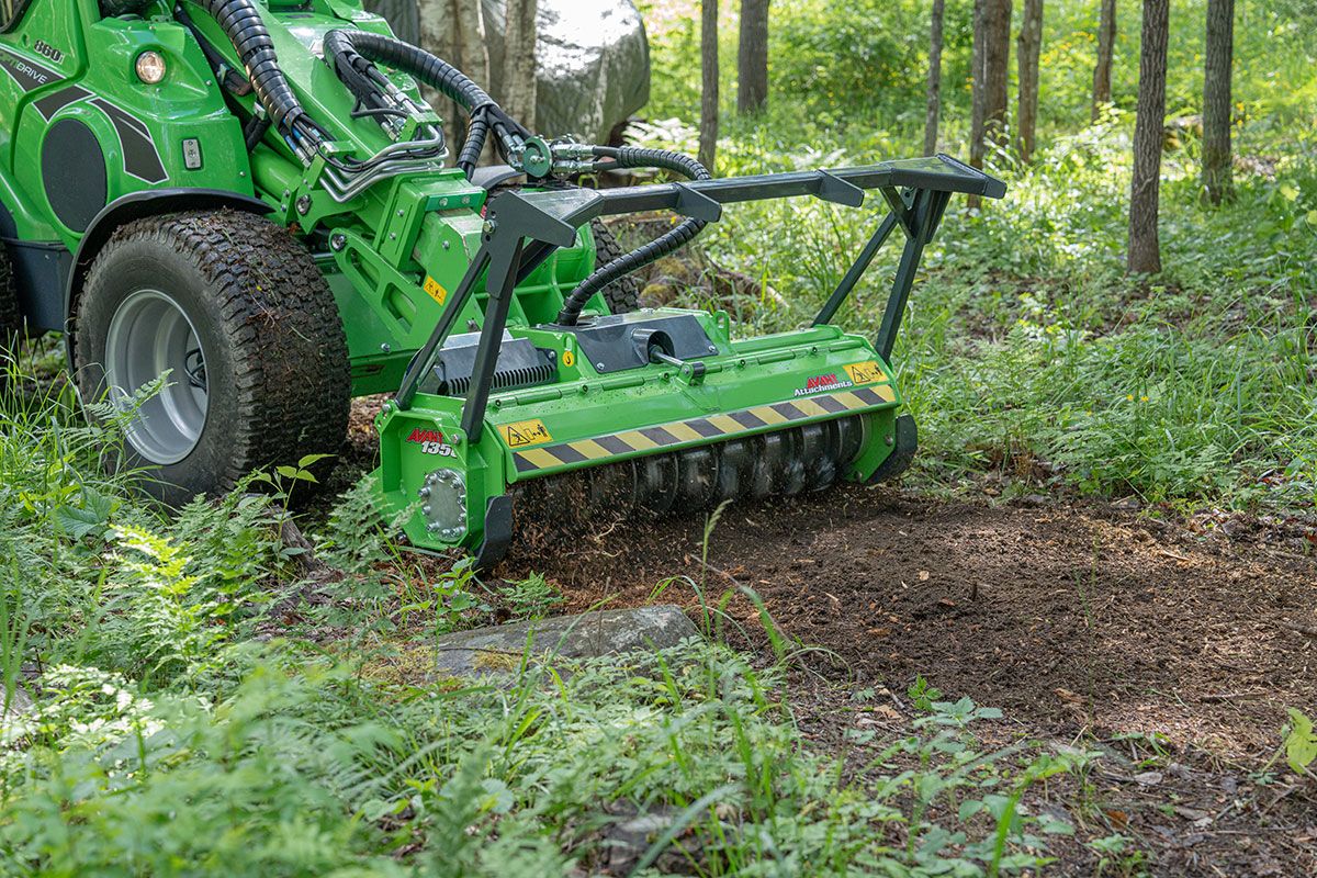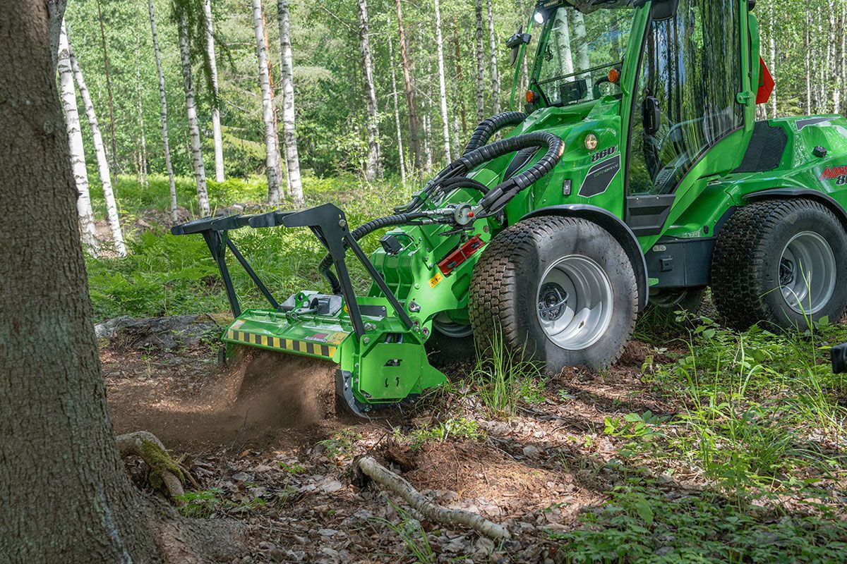 Fräsen är utrustad med en horisontell tryckstång framtill. Den leder materialet som kapas, och tryckstången kan även användas för att flytta och vända omkullfallna träd och grenar vid behov.